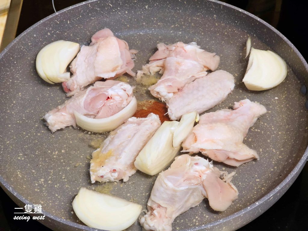 雞肉洗淨放入鍋中,加水至剛蓋到雞肉,放入少許薑蓉、半個洋蔥及少許紹興酒,開火汆水去腥味。直至雞肉血水及污物滲出,沒有白沫漂出後,倒掉鍋中的水更換一鍋清水煮雞。