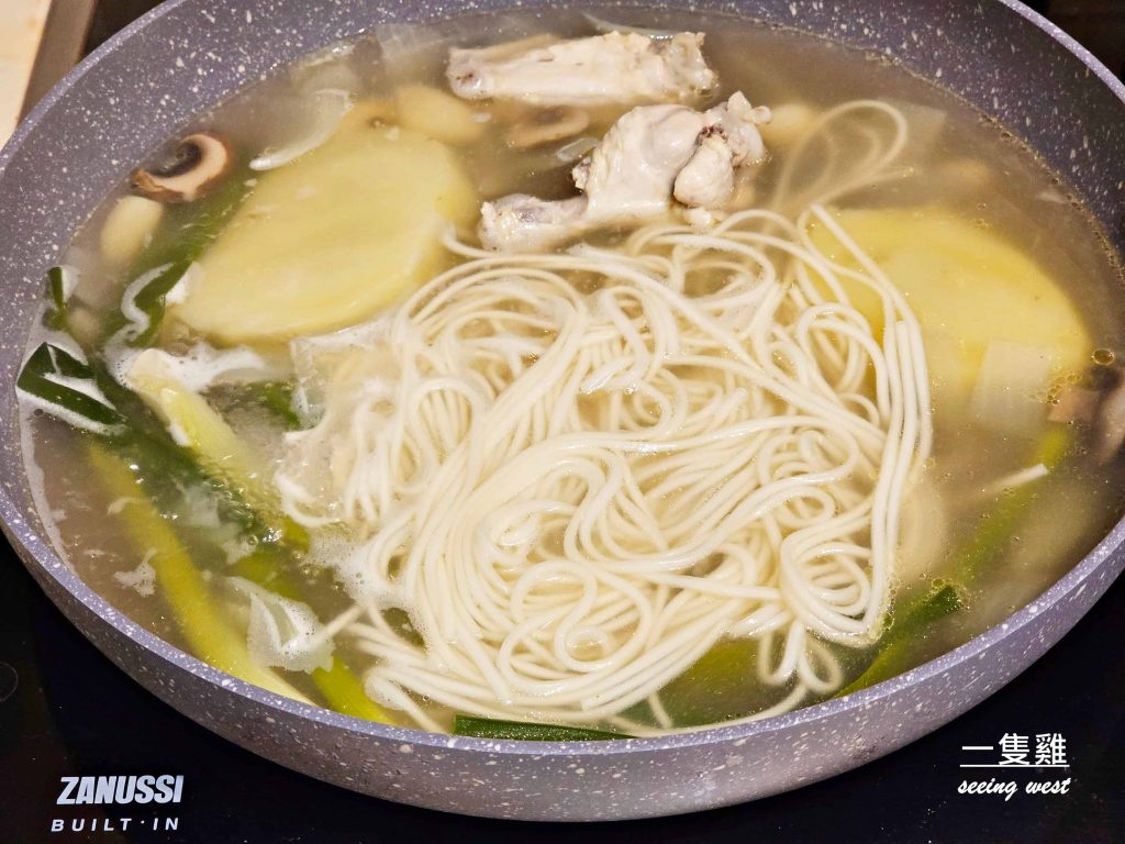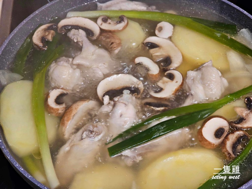 鍋中加入蒜頭、蔥、薯仔及菇,中火煮大約15分鐘,加少許鹽調味。