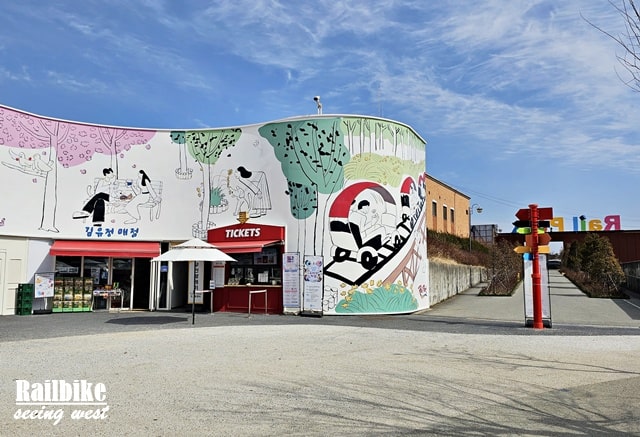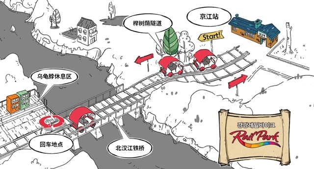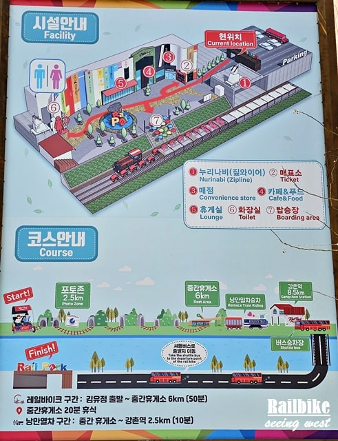 入口旁邊水牌介紹設施分佈,分別有售票/取票處、CAFE等。下圖講解金裕貞路線,全程8.5km,頭6km是自行車,後2.5km是乘座浪漫列車。