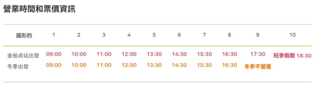 注意需要比預訂發車時段提早10-20分鐘到達等候安排上車,網上訂票需要到現場提早車體票。