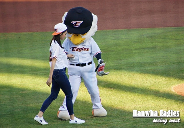 鷹隊吉祥物拖著沃川女神李美珠到投球位置。
