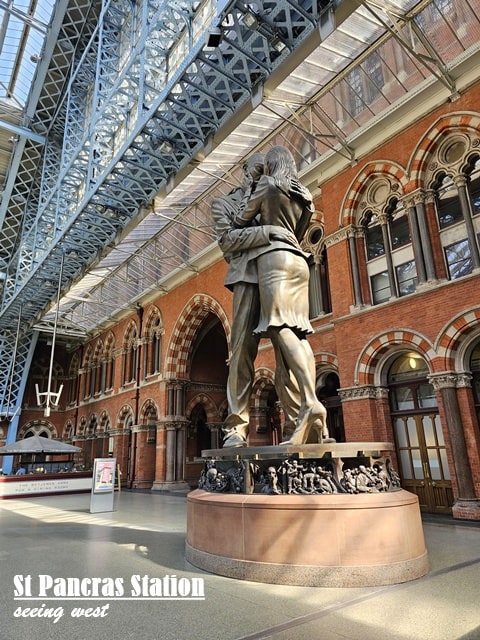 位於 St. Pancras 車站中央的 Lovers Statue,又稱 The Meeting Place,是一座高達 9 米的青銅雕像,由英國雕塑家 Paul Day 設計完成,於 2007 年正式安裝。雕像描繪一對戀人在重逢時緊緊擁抱的場景,寓意車站作為「分離與重聚」的空間。