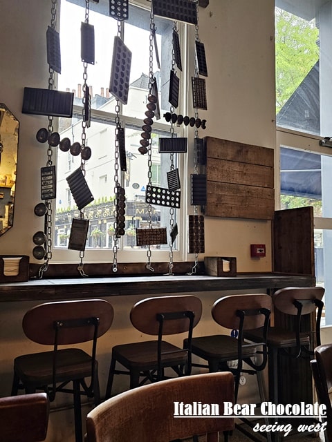 店內裝修走工業風風格,用鎖鏈吊著一排排朱古力模。