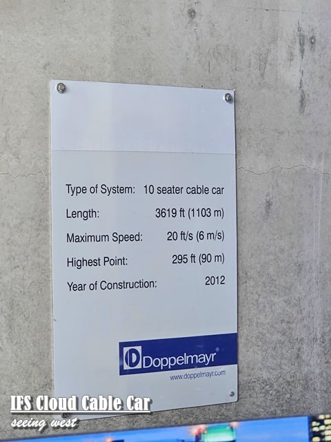 告示牌告示纜車全程1103米,最高速每秒6米移動,最高點90米,每卡車廂可載10人。