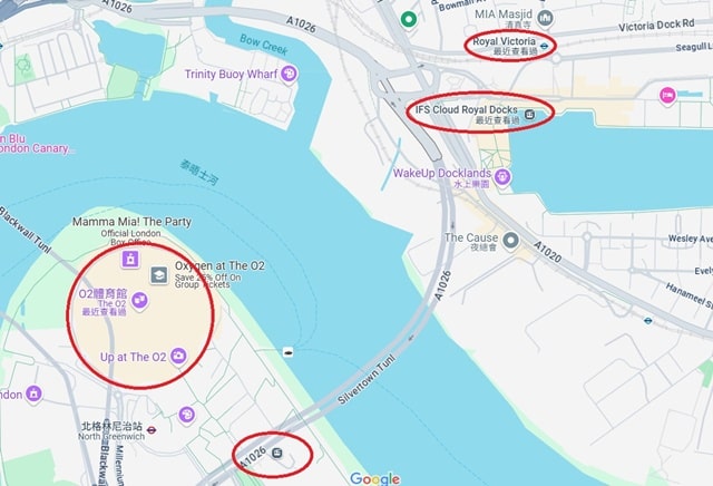 北岸站(Greenwich Peninsula Terminal):靠近 North Greenwich 地鐵站(Jubilee Line),步行約 5 分鐘。